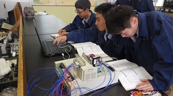 今回は、電気科2年の4班の実習を紹介します。実習題目は「PC(プログラムコントローラ)によるタイマ回路・カウンタ回路」です。PCに内蔵されているタイマ、カウンタを用いた基本回路のプログラムを作成し、その動作を理解するとともに、簡単な回路の設計ができるようになる事が目的ですが、生徒は3人でチームを作り、それぞれ与えられた課題を話し合いながらクリアしていました。PCを動かすためにノートパソコンでプログラムを作ります