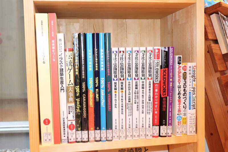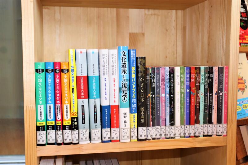 進学や就職に必要な小論文をはじめとし、文化遺産、アート系の書籍が並びます。