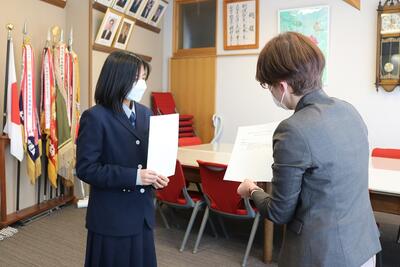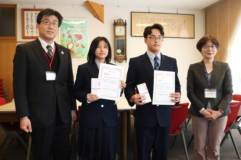 クラスを代表して表彰を受けた、動画部門の中村さん、漫画部門の新門さん。「全員で取組んだ作品が受賞したことを、とてもうれしく思います」。