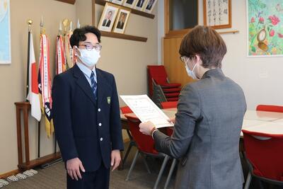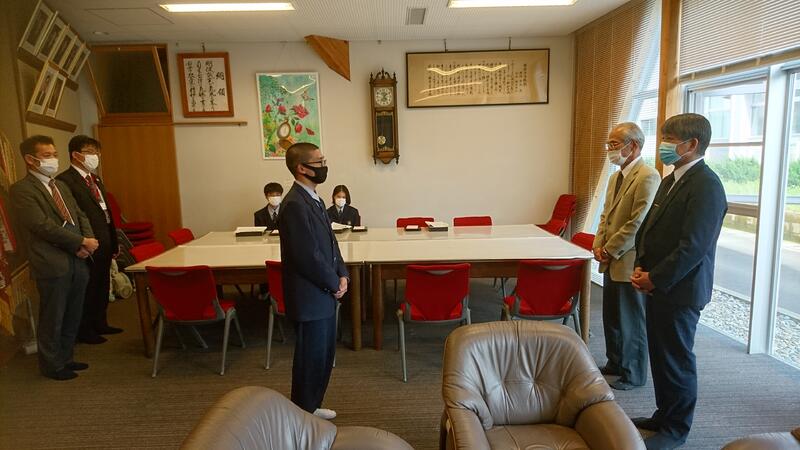 県立高校「推し高」紹介コンテストで受賞した、2年電気科の生徒達を表彰するために、熊本県高校教育課より松村審議員が来校されました。