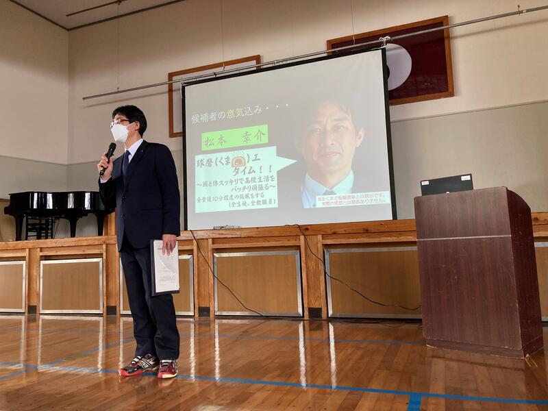 後半では、「球磨工議会議員選挙」と称し、2学年の先生方に立候補者役として、先生方に公約を掲げてもらい、演説をしてもらいました。「食後の休息時間」や「授業代替として発電を行う」など、先生方の様々な公約に、生徒達は楽しみながら演説を聴いている様子が印象的でした。