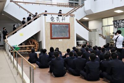 電気科は階段の上で自己紹介。1年生は緊張したかな?