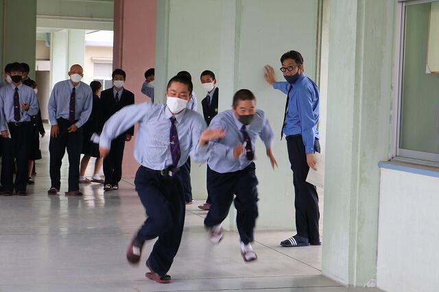 2年生物理の授業は、「運動の表し方・速度・速さ」から学びます。実際に10mを歩いて、かかる時間で速さをもとめる。実習棟の廊下に移動して実験しました。