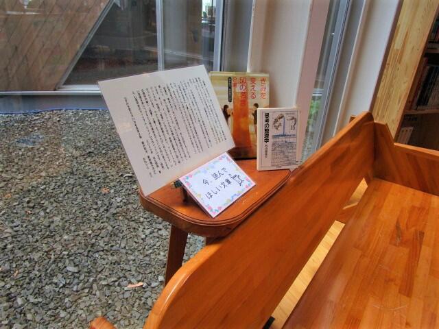 図書館入り口には「今読んでほしい文庫」という特設コーナーがあります。時々確認に来てみてね。