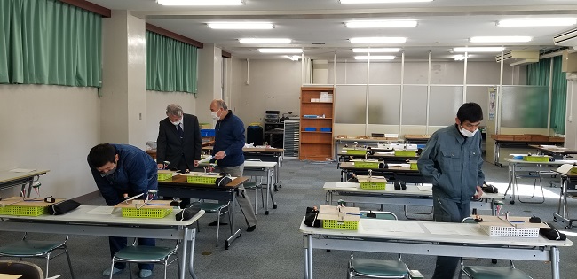 途中で試験管2名が作業等についてチェックを行い、終了のチャイムで生徒は退室した後、5名の先生でチェックを行いました。