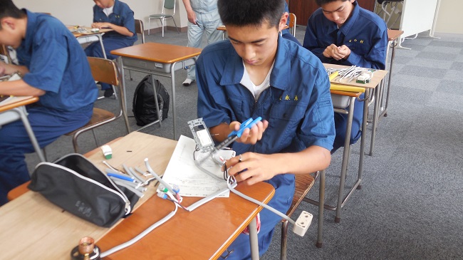まずは、電線の被覆を剥ぎ、準備をします。狭いスペースで生徒は、やりにくいみたいです。