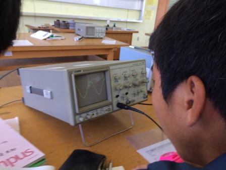 今回の実験では、一般家庭の100vと同じような「交流波形」をオシロスコープで見ながら測定します。みんな興味を持って取り組んでいました!
