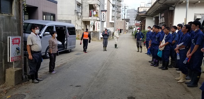 10月19日(月)の4・5・6時限の工業技術基礎(実習)の時間を使って、第2回目となる電気科1年(生徒27名)と職員(5名)で復旧ボランティア活動を行いました。場所は、人吉旅館で主に、床や天井の外してある板の泥落としと拭き掃除でした。生徒達は、部活動や電気科1年としては2回目ともあり、テキパキと動いてくれ、予想以上に早く終わりました。
