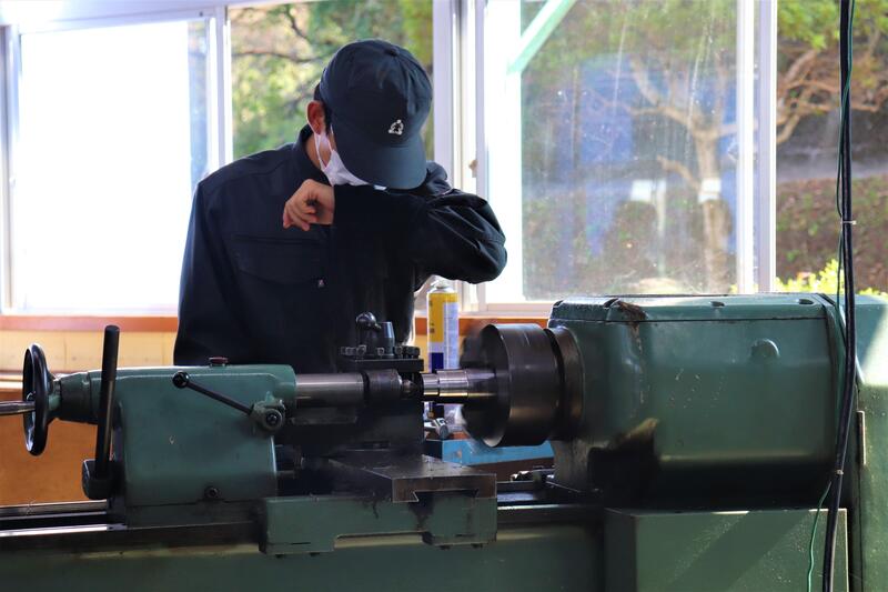 旋盤加工です。熊本県高校生ものづくりコンテストで優勝した選手が実演してくれました。