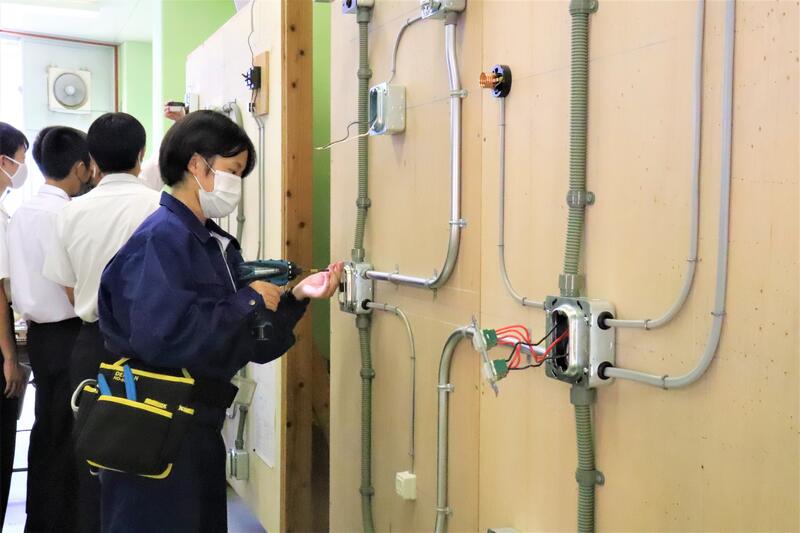 ものづくりコンテスト「電気工事」出場選手の実演。
