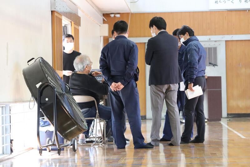 休み時間に音響のスタッフさんに配線など専門的な質問をする本校職員。