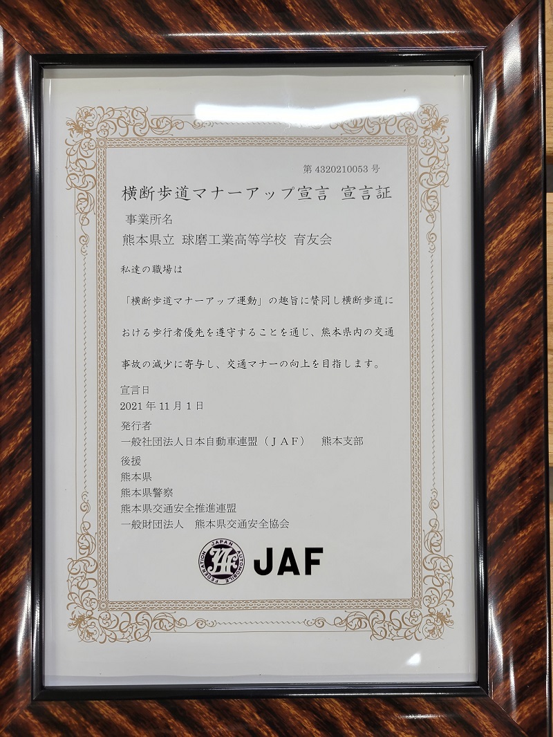 JAFの「横断歩道マナーアップ運動」の趣旨に賛同し横断歩道における歩行者優先を遵守することを通じ、熊本県内の交通事故の減少に寄与し、交通マナーの向上を目指す事を目標に、11月1日(月)付けで、『横断歩道マナーアップ宣言』をしました。