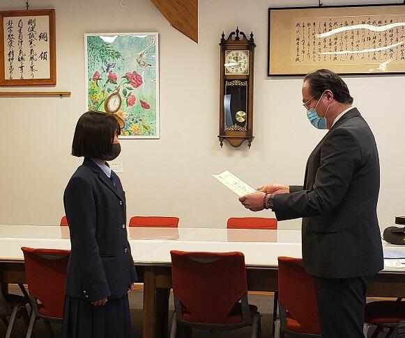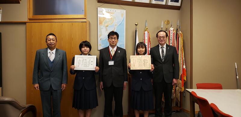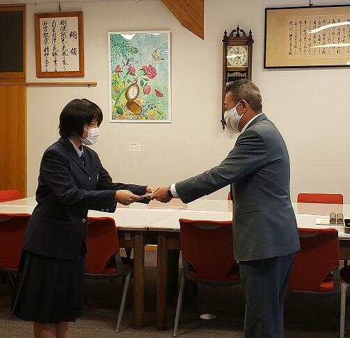 本校にて、令和3年度「税に関する作品」の表彰式が行われ、2年建築科の岩水眞秀さんと、同じく2年建築科の前田和成子さんが表彰を受けました。