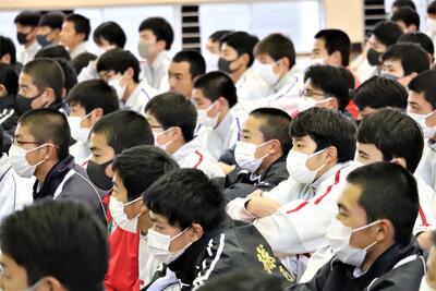 開会式。原田校長の話をしっかりと聞く選手の皆さん。