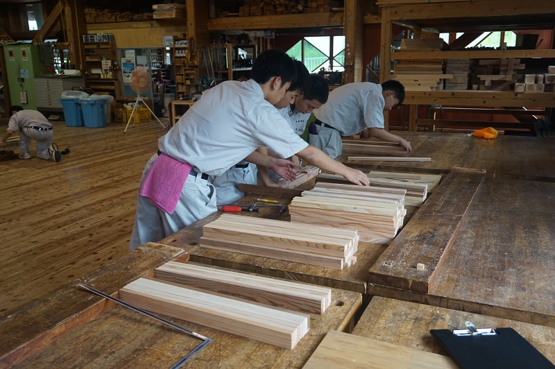 水上村白水阿蘇神社神楽殿高欄修理は現在、地覆、平桁、たたら束の加工を分担して行っています。大工道具で取り扱いが難しいとされる「鉋」を使う作業が多く、悪戦苦闘していますが毎日汗を流しながらよく頑張っています。