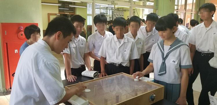 7月31日(水)の9:00~12:00に中学生体験入学が実施されました。今年も地元の中学生だけでなく県内外から363名の中学生が暑い中参加してくれ、説明する生徒も「少しでも電気科の事を知って欲しい」と、汗だくになりながら頑張って説明していました。