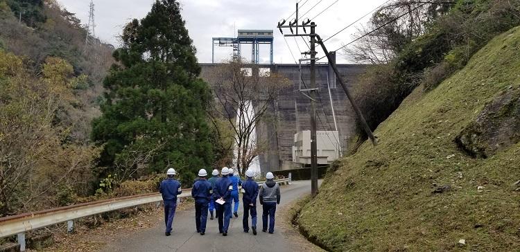 九州電気保安協会と球磨電設は、水上村にある熊本県営の「市房第一発電所」の水車発電機等の更新工事に携われており、その現場見学をさせていただきました。市房ダムは1960年(昭和35年)に運転を開始し、約60年余りが経ち老朽化しているため、全面リニューアルし発電能力のアップを図るとのことです。主要納入更新機器は、縦軸カプラン水車、三相交流同期発電機、入口弁、励磁装置一式、調速機、圧油装置、水車制御盤一式、給排水装置、圧縮空気装置一式、制御・保護装置、高圧配電盤、ケーブル工事等です。