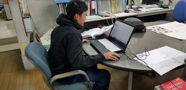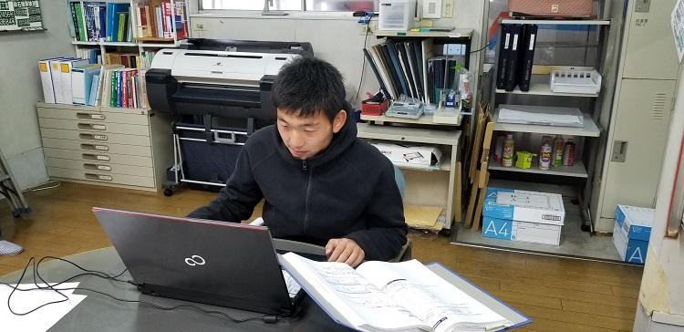 大和冷機さんでは、一人は現場での作業、もう一人は事務所でCADを使っての設計を写すという作業を行っていました。電気科では手書きによる電気製図を2年生で行いますが、CADを使っての製図は、3年の実習や課題研究でしかできないので、生徒はいい勉強になっていると思います。