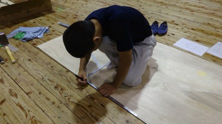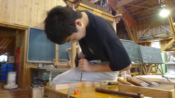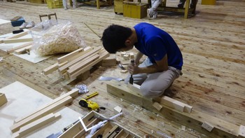 競技自体は27日(土)~28日(日)の2日間、計11時間30分(11時間45分打ち切り)の制限時間内に「屋根筋かいのある小屋組」の製作を行います。原寸図を描き、部材の木削り、墨付け、加工仕上げ、組立てという順で作業を行っていきます。入賞できませんでしたが、夜遅くまで残って練習し頑張って取り組んでいました。