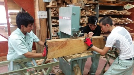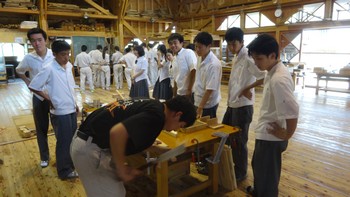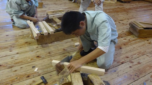 ■伝統建築コース:木材加工(鋸の横挽きとたて挽き)