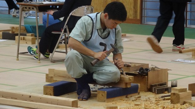 今年は、建築科の工場長、建築科伝統建築コース3年生の藤井君(伝統建築部部長)が出場しました。大会職種は、14部門からなり藤井君は建築大工部門に出場。垂木・梁・火打ちの屋根の一部模型を墨付け・加工・組立を行いました。20歳以下の若年者対象とした大会で、社会人も出場する大会で、結果は敢闘賞(4位)、 高校生だけなら2位という成績でした。夏休み返上で朝から夜遅くまで良く練習をし、がんばってくれました。来年は、専攻科へ進学を希望しているので、是非出場し優勝して貰いたいです。