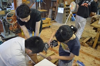 内容:人吉市内の小学5、6年生とその保護者のペアで、本校生徒の指導により木材を加工、組み立てし、縁台、あみあみ椅子の作成を行いました。普段使い慣れない、のこぎりや、かなづちを使用しての作業でしたが、楽しく作品づくりを行いました。