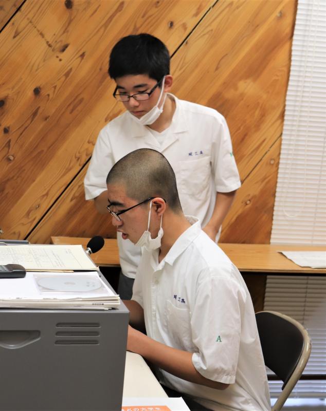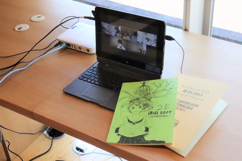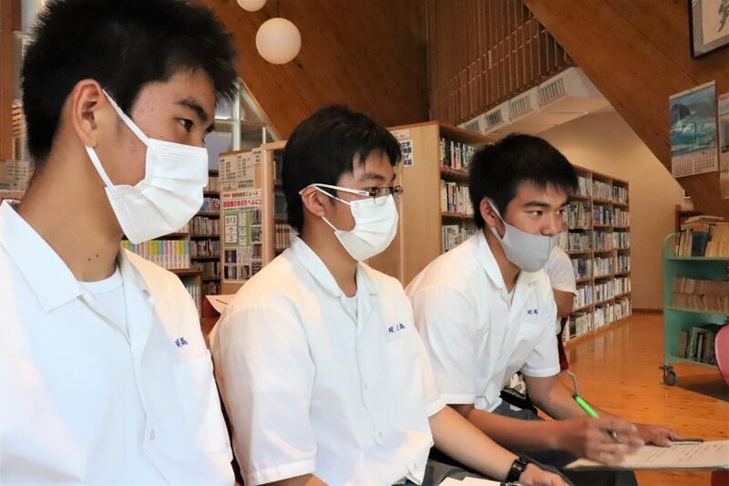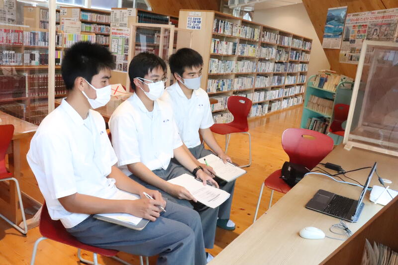 本校からは、図書委員長3MB清永君と3MB大坪君、副委員長の2A生田君が参加。Zoomを使ってのこの会議、始めは緊張と、オンラインのため、各校の距離が縮まりません。