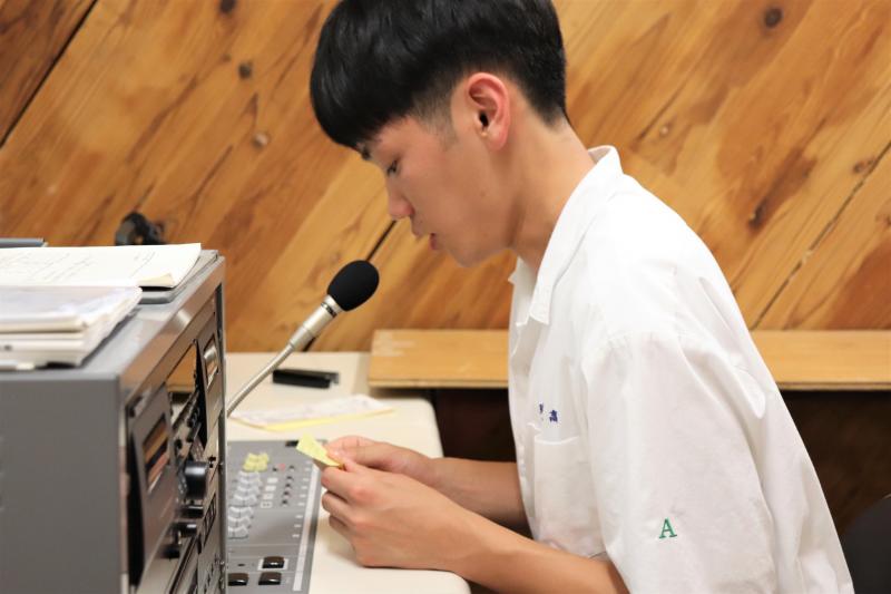 放送室の隣で出番を待つ委員長。初めての校内放送ですので、緊張しています。