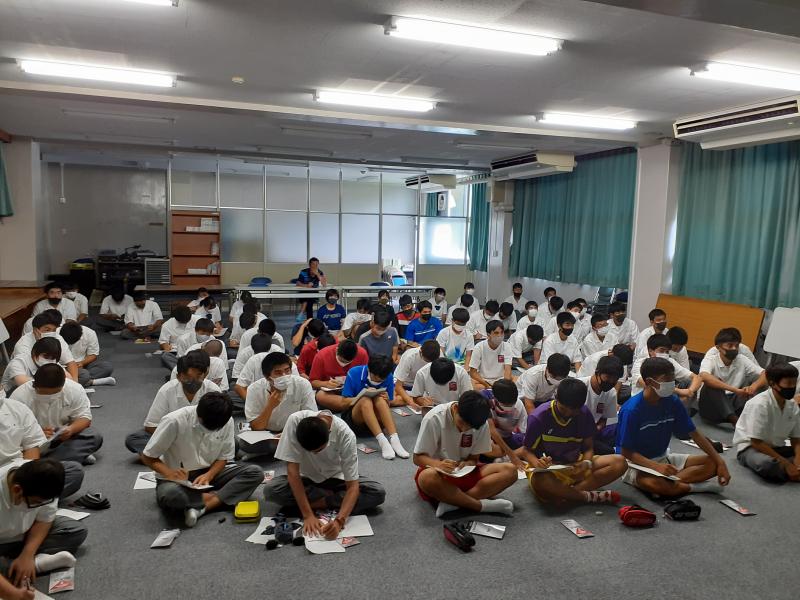 7月2日(金)13時30分から視聴覚室にて、江崎グリコ株式会社の方が「熱中症対策と栄養補給」についての講演を開いていただきました。ハンドボール部、カヌー部、ソフトテニス部、柔道部が参加し、栄養・休養・運動についてポイントを押さえ、真剣な表情で聞き入ってました。