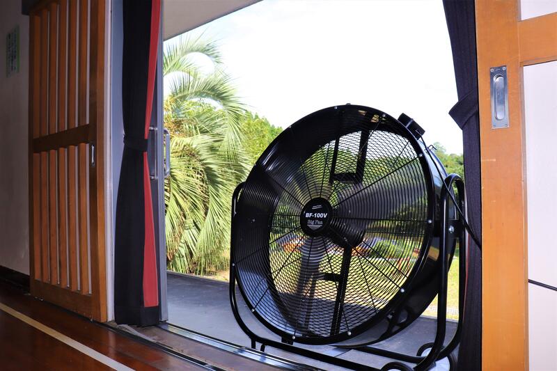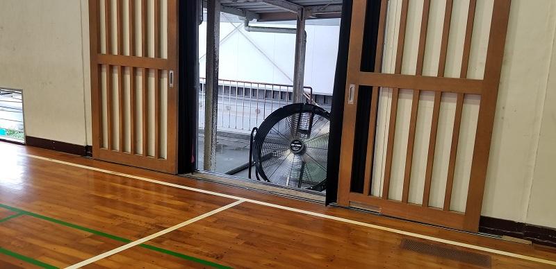 最近はすっかりおなじみの巨大送風機です。複数台が体育館でお仕事しております。