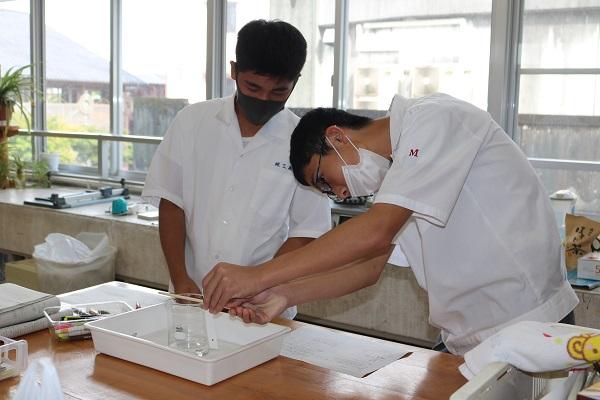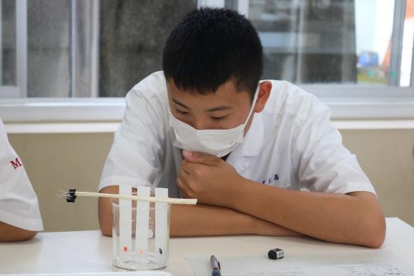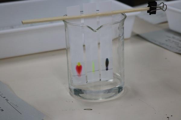 本日3限目、1MAの化学基礎で物質の分離方法の一つ、ペーパークロマトグラフィの実験をしました。指導は、教科連絡委員が担当。事前に講義を受け練習を繰り返して臨みました。エアコンのない化学室で汗だくになりながら、緊張はしたと思いますが、本番が一番の出来でした!