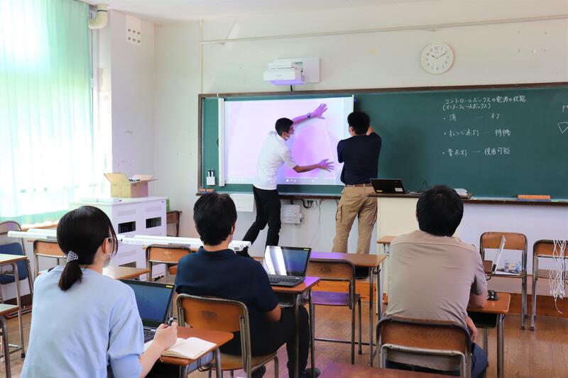 専用のポインターを使えば、映し出されたデータの上にメモを書込んだり、大事な部分をマークすることもできます。新しい機能に興味津々の先生達。