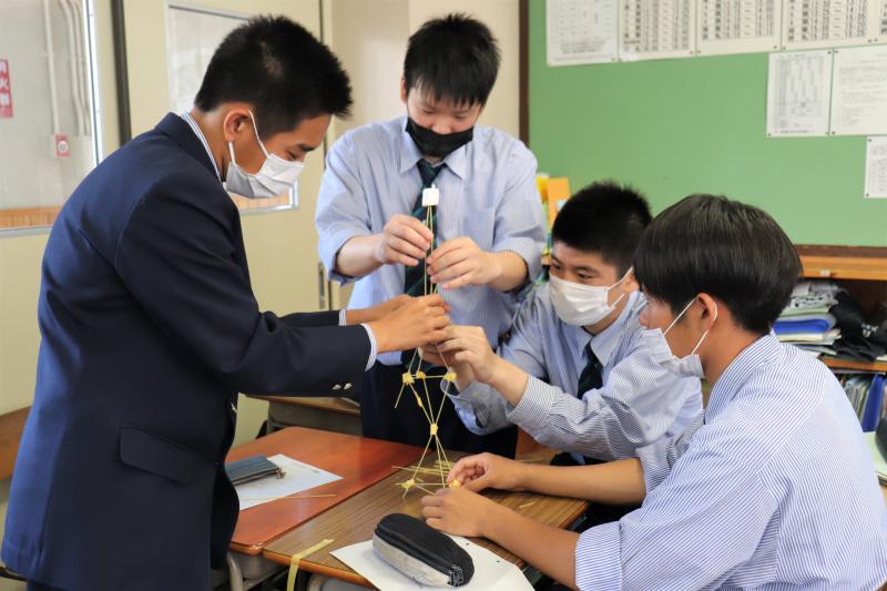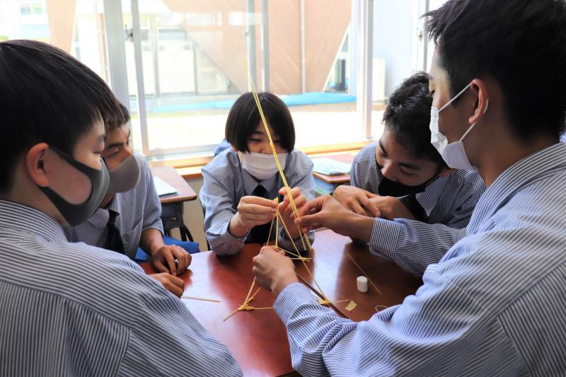 3年機械科A組。設計。グループでマシュマロタワーを作っています。細い棒はパスタです!