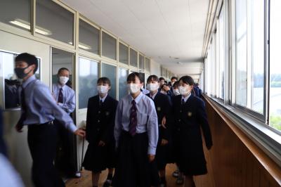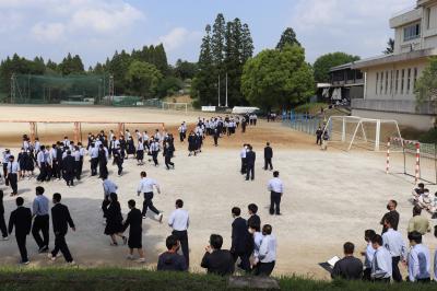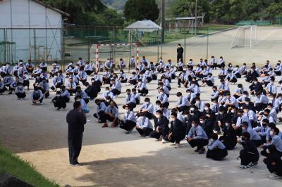 令和2年7月豪雨からまもなく1年を迎える4月30日(金)に1年生の避難経路確認を目的とした避難訓練を行いました。全校生徒の集合・点呼後、校長先生、防災主任、生徒指導主事からの講話を行い、日頃の生活の過ごし方や防災に対する意識の向上を呼びかけました。