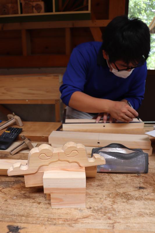 祠の「蛙股(かえるまた)」という部分を彫刻しています。
