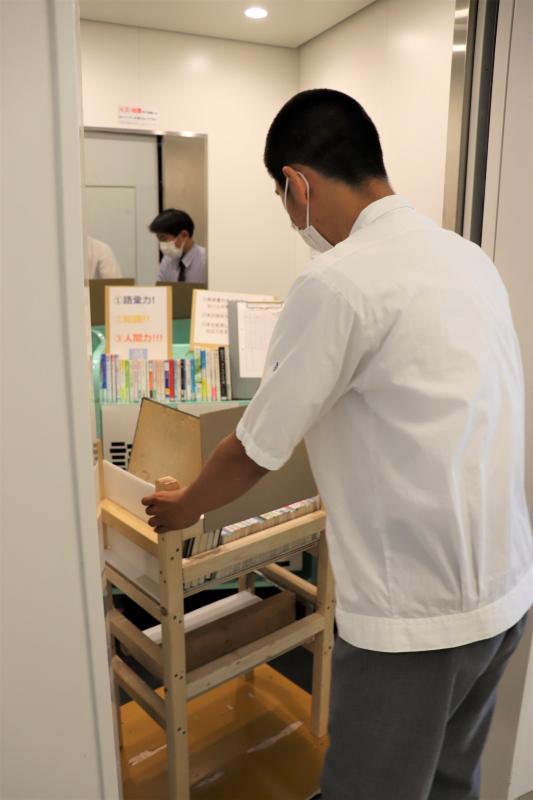 球磨工生におすすめの図書およそ30冊をカートに乗せ、エレベーターで出発
