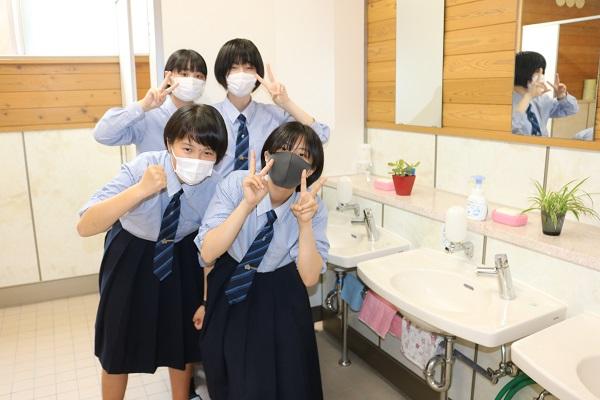 電気科棟女子トイレの掃除を担当するのは、電気科2年の女子4名です。「トイレを見れば学校がわかる。学校で一番きれいなトイレにしよう!」を合言葉に、毎日せっせと磨いてきました。自慢は、長年蓄積して黒ずんだ水垢の輪がないピカピカの便器と手洗い場。手の触れる箇所は、消毒もしています。水回りの掃除のコツは、完璧に水気をふき取ること。排水溝も、定期的な管の掃除で、嫌な臭いを発しなくなりました。曇りのない鏡で身だしなみチェックをどうぞ。