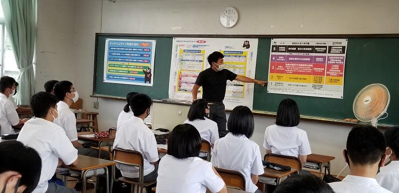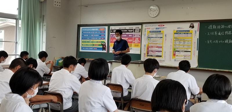 「くまもとマイタイムライン」は今年の4月28日(水)に、熊本県のホームページで公表されました。球磨人吉地域では昨年の7月の豪雨により甚大な被害を受けました。そこで、梅雨に入ったこの時期に、生徒達がこのマイタイムラインの計画立案を通して、『命を守る意識を高める』ことを目的として、授業を行いました。