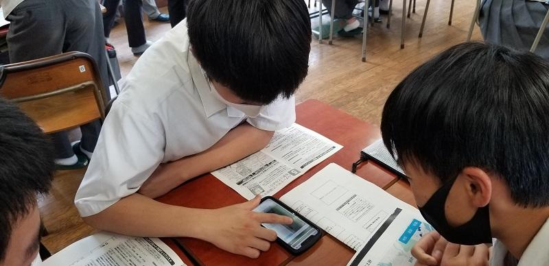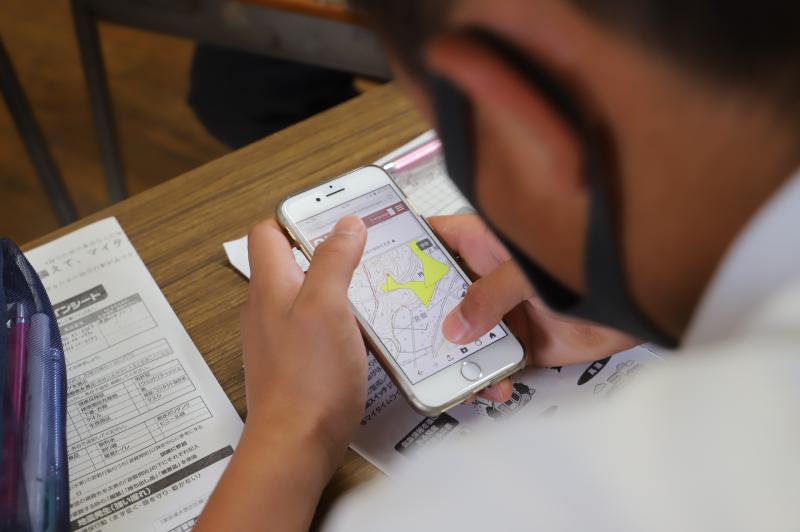 携帯を使ってハザードマップ(防災マップ)で災害リスクを調べる生徒達