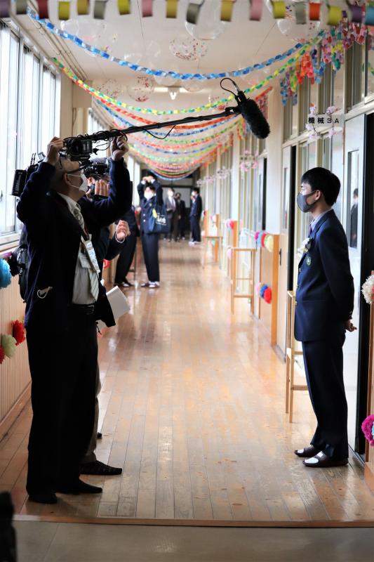 教室では、生配信の試験放送をかねて表彰式を見ています。廊下には動画配信のために奮闘する職員の姿。