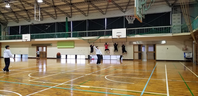 男女バスケ部の朝練の様子(奥ではカヌー部が懸垂で鍛えています)
