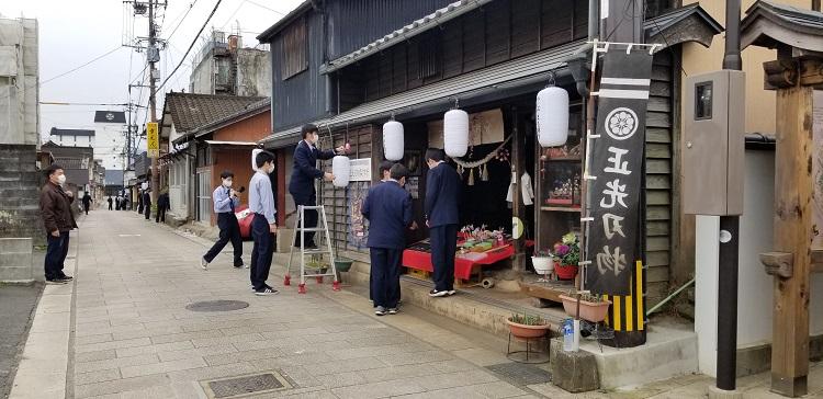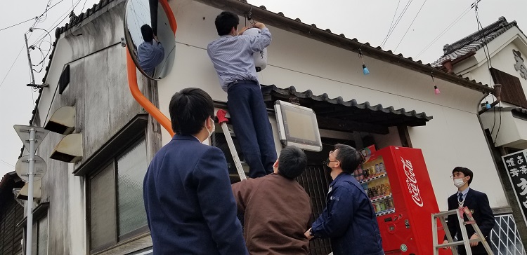 そして、2月11日(木)の13時より、人吉市鍛冶屋町への設置を行いました。今回ボランティア活動に参加してくれたのは、弓道部9人、溶接部8人、写真部3人、電気工作部1人、職員5人の計26人です。
