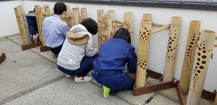 本校では、第2種電気工事士や第1種電気工事士に多数の生徒が合格しており、その技術を生かした竹灯籠の中に入れる『電飾』の製作や設置による電気配線を行ってきました。