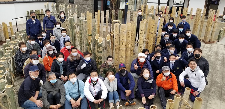 生徒一人一人が7月の豪雨災害からの復興を祈念しながら、一つ一つ心を込めて製作しています。2月13日(土)18:30~点灯式、3月20日(土)まで燈りをともしますので、ぜひ『竹灯籠の燈り』をご覧いただけると幸いです。