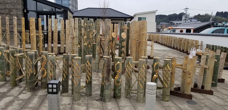 本校では、『技術ボランティア』として4年前から人吉商工会議所青年部の依頼を受け、毎年2月上旬から3月の中旬まで人吉市鍛冶屋町公園を中心に『竹灯籠』に燈りをともしてきました。