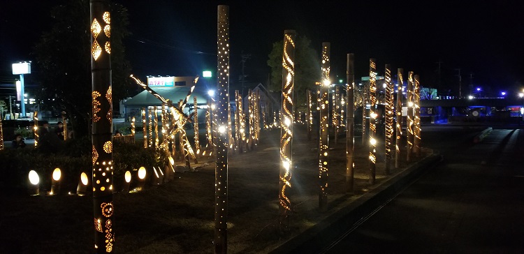 今年は、2月13日(土)~3月20日(土)18:30~、7月豪雨復興祈念行事として、いずみマチ・テラス実行委員会(出水市)、うすき竹宵実行委員会(臼杵市)、玉名燈師(玉名市)、CHIKAKEN(南関町)、NITTAKE(日南市)の協力を受け、鍛冶屋町だけでなく、JR人吉駅前、青井阿蘇神社の3カ所に、竹灯籠の燈りをともします。