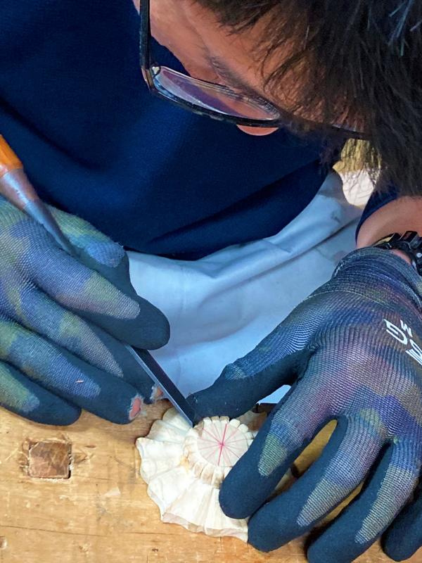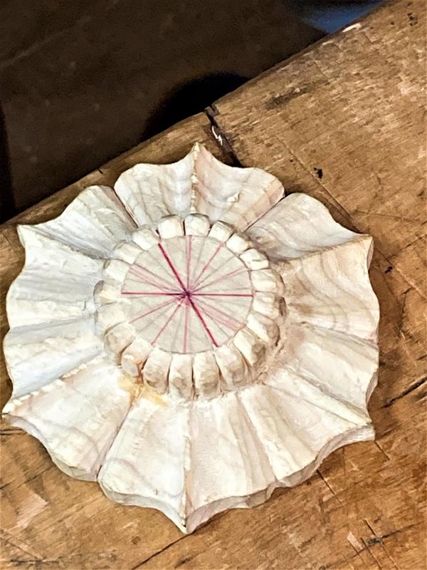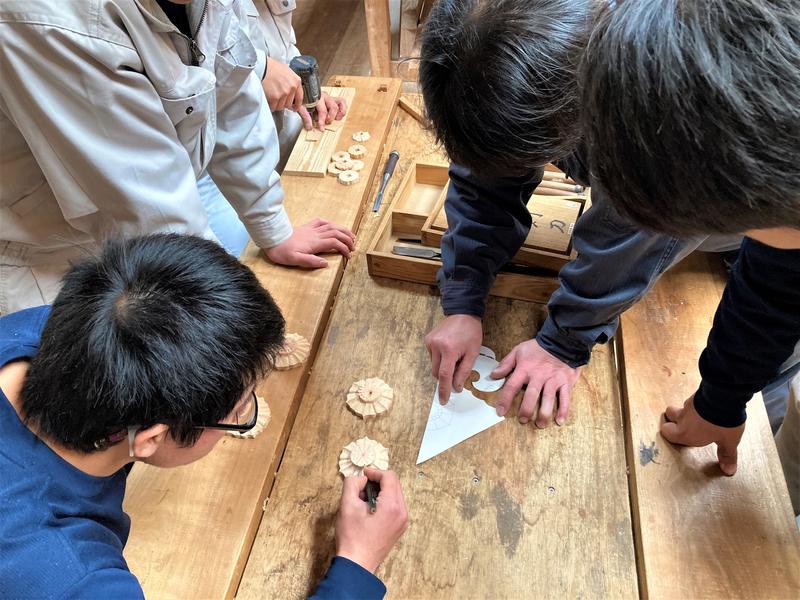 釘かくしのための「六葉(ろくよう)」を彫る練習をしています。