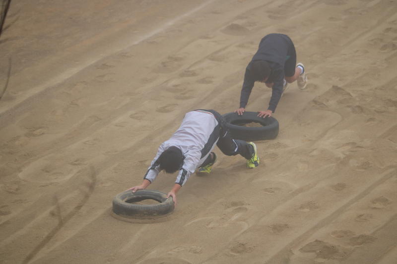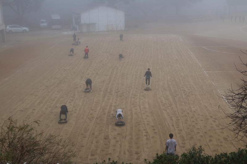 霧の中のハンドボールコート。整備のために数日前に入った砂を一面にひろげ、ローラーでならしていましたが、今朝はタイヤを押していました。