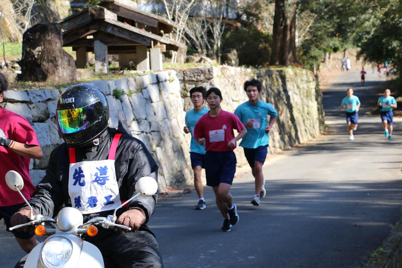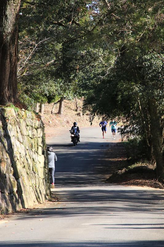 石水寺前です。スタートからおよそ20分後、先頭ランナーが見えてきました
