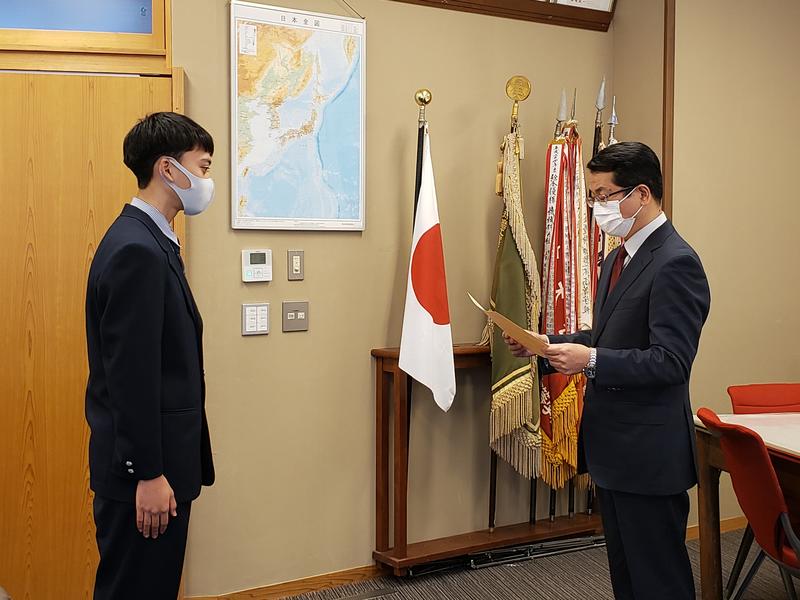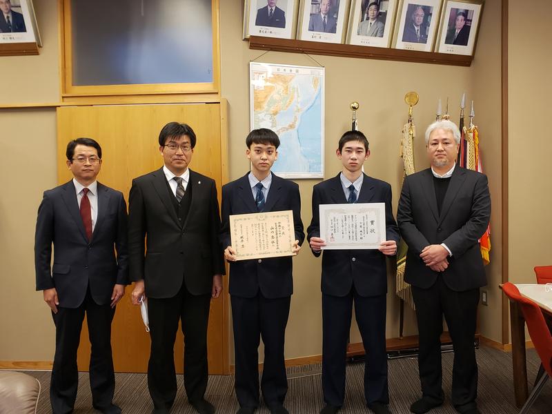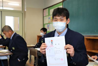 12月16日、本校にて、令和2年度「税に関する作品」の表彰式が行われ、2年機械科A組の山内恵伍君と、同じく2年機械科A組の中園颯馬君が表彰を受けました。